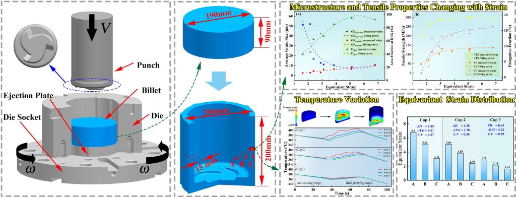 张治民教授团队,针对航空航天和国防军工装备用轻合金舱体各向异性大的痛点,提出了旋转挤压成形新技术,有限元模拟结合物理实验,精确设计与控制成形件的温度场及应变场,在自主研发的国内外首台多向加载旋转挤压机上,加工出弱各向异性镁合金舱体。成果报道于制造领域顶刊《Journal of Materials Processing Technology》(链接://doi.org/10.1016/j.jmatprotec.2023.118081)。免费av影片