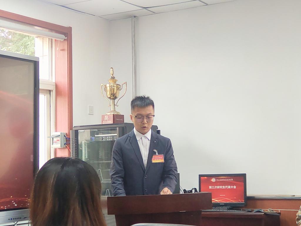 郝诗韵书记代表学院党委为本次大会致辞。郝老师充分肯定了广大研究生干部过去一年中的努力工作,同时也向新一届研究生会、全体研究生代表以及全体研究生提出了四点希望:一是希望广大同学坚定理想信念,成为堪当民族复兴大任的时代新人;二是希望广大同学践行社会主义核心价值观,成为德智体美劳全面发展的建设者和接班人;三是希望研会同学服务研究生成长成才,成为研究生的贴心人;四是希望广大同学练就过硬的本领,成为学生的主心骨。郝老师进一步强调,全体研究生代表要以习近平新时代中国特色社会主义思想为指导,在校、院党委的正确领导下,在校研究生会的具体指导下,立足立德树人根本任务,服务学生成长成才,发扬太行精神,秉承“致知于行”校训和“真材实料,精益求精”院训,团结带领全院研究生,为实现中华民族伟大复兴的中国梦贡献中北材料人的青春智慧和力量!