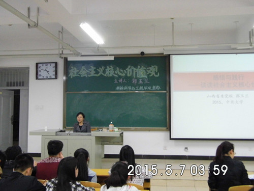 特邀中共山西省委党校、山西行政学院省情与发展研究所副所长郭玉兰教授为全院学生党员召开了题为“感悟与践行——谈谈社会主义核心价值观”的学习报告会。