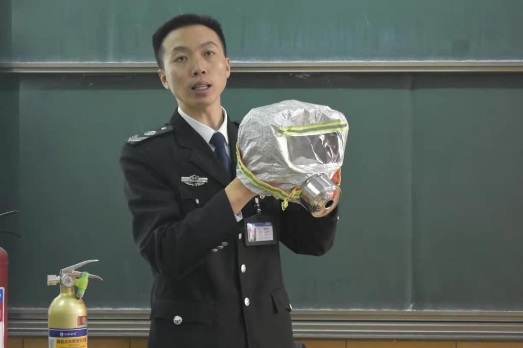 之后,张俊文教官详细地给同学们介绍了灭火器及过滤式消防自救呼吸器的构造及使用方法。张教官在介绍的过程中,不仅讲授了使用的消防常识,还亲自示范了如何正确佩戴过滤式消防自救呼吸器,这使在场的同学们对灭火器及过滤式消防自救呼吸器有了深刻的印象。