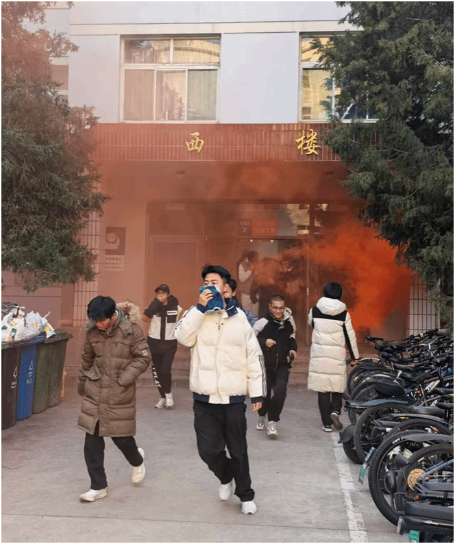 疏散逃生演练于16:00开始,文韬二、文韬五、文韬六学生公寓点燃烟饼,模拟火灾发生,值班人员第一时间发现火情,有序组织学生疏散。火警响起后,同学们第一时间离开宿舍,规范有序撤离,数分钟内安全抵达集合点。