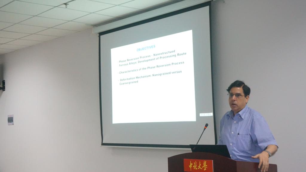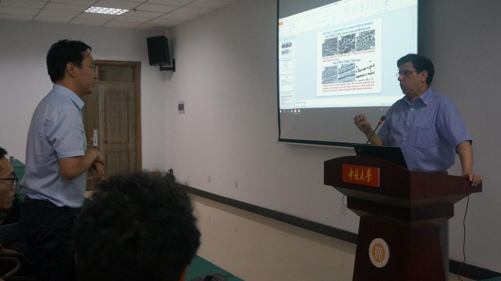 Misra教授主要致力于关注轻质结构构件强度和延性提升的矛盾。改进以往通过控制包括晶界、位错密度和孪晶界等缺陷解决强度-延性权衡的方法。开创性的提出通过相变诱导微合金化在不锈钢等金属材料中获得超细晶粒结构,使之能够承受较大的塑性变形,在明显低于绝对熔点的温度下获得超过100%的延伸率。这一概念代表了微合金钢和不锈钢全新材料加工模式,将充分利用其优异的力学性能将材料的应用扩展到前所未有领域。报告的内容深入浅出,融知识性和趣味性与一体,获得了师生的热烈欢迎。会后,Misra教授与师生进行了学术讨论。