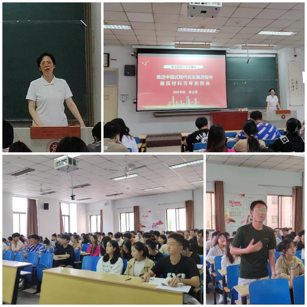 郭老师简要介绍了现代化的起源,分析我国为何必须走中国式现代化道路及中国式现代化的五大特征和本质要求。通过分析我国卡脖子技术中有关材料的技术难点,号召材料青年在新材料、新能源等科技领域发挥主力军作用,努力实现关键核心技术自主可控,成为中国式现代化建设、中华民族伟大复兴必不可少的人才力量。她激励材料学子勤奋学习、锤炼身心,树立科技兴国的远大志向,在专业领域敢于创新、勇于突破,立志报效祖国、服务人民。