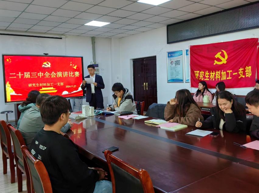 2024 年 11 月 27 日,研究生材料加工第一党支部在液态成型中心会议室开展以 “强国有我 逐梦青春” 为主题的演讲比赛主题党日活动,支部全体党员和入党积极分子参加了活动,比赛由支部副书记宋子扬主持。